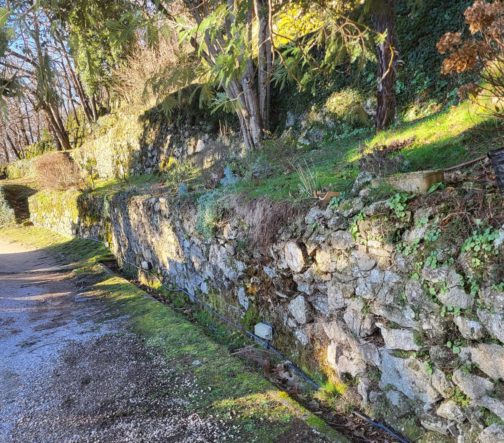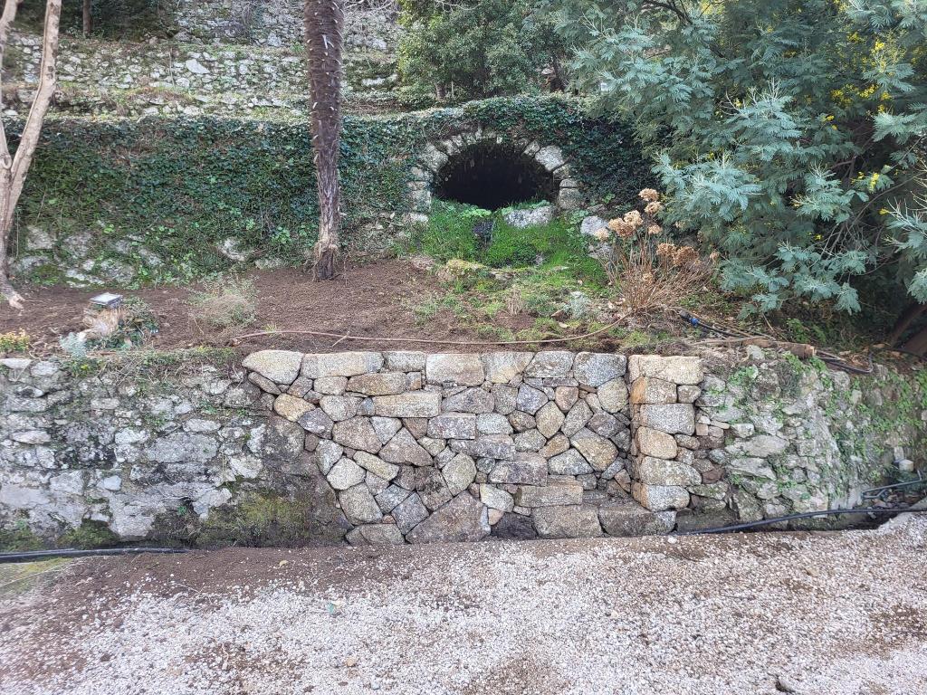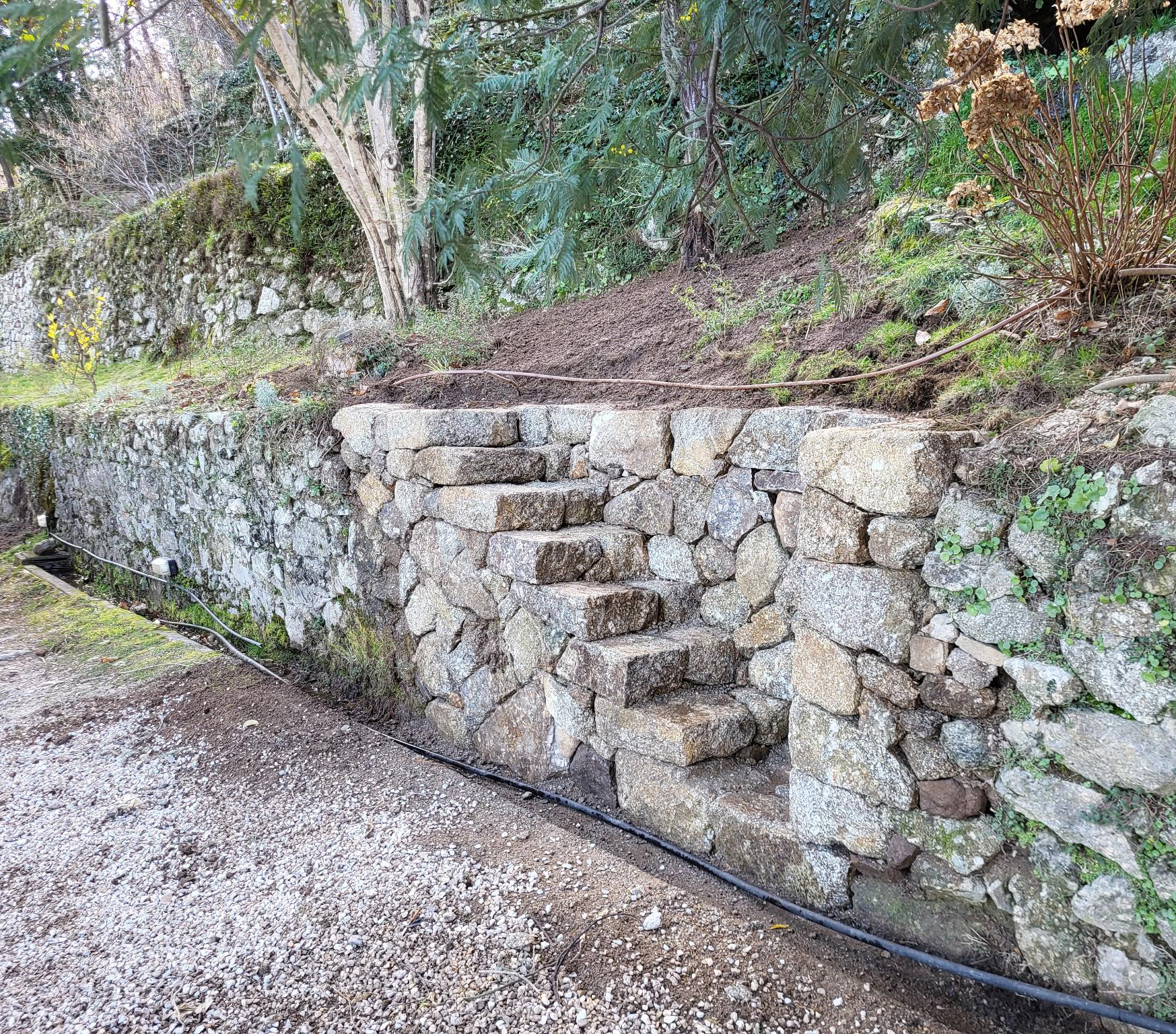 Intégration d’un escalier en pierre sèche dans un mur de soutènement.